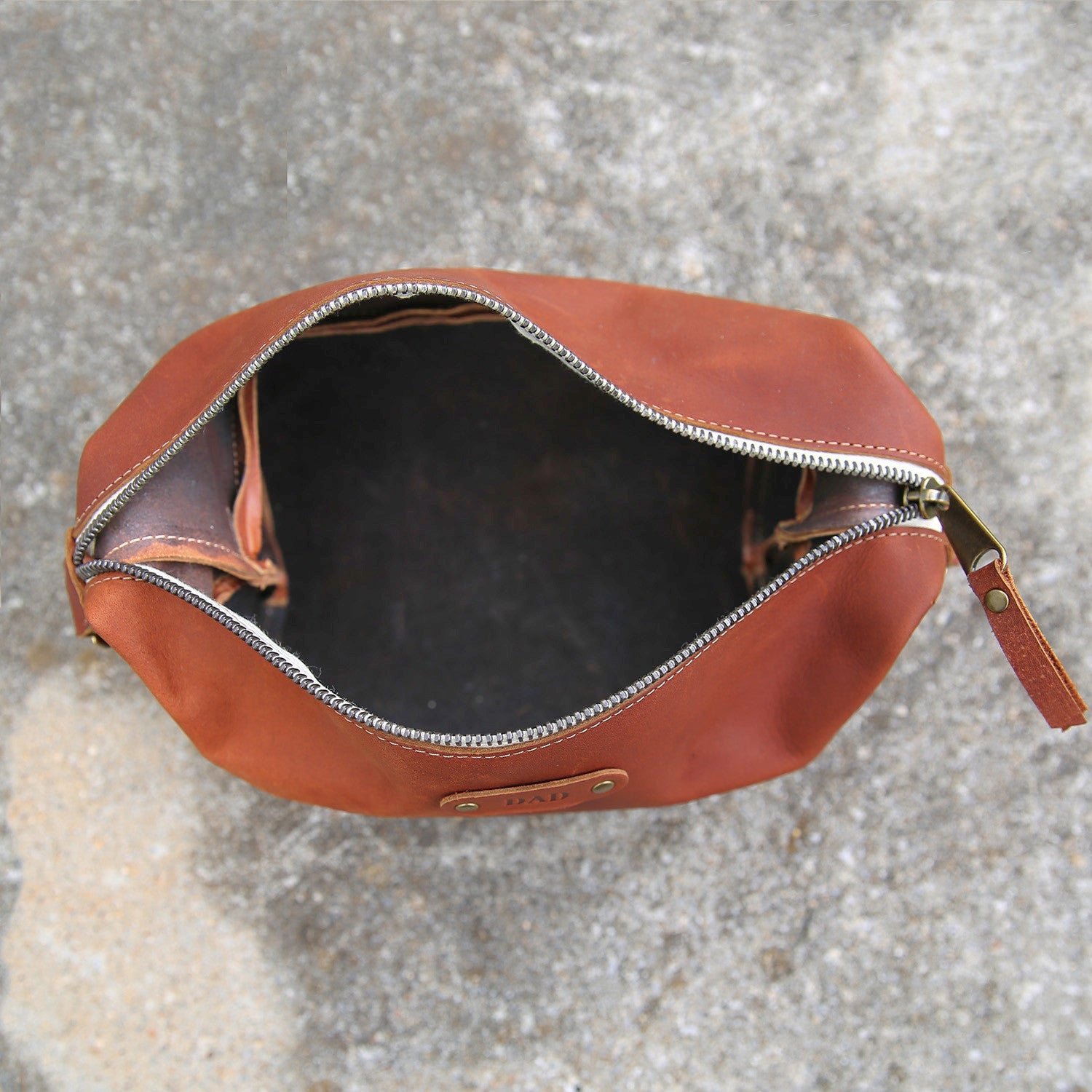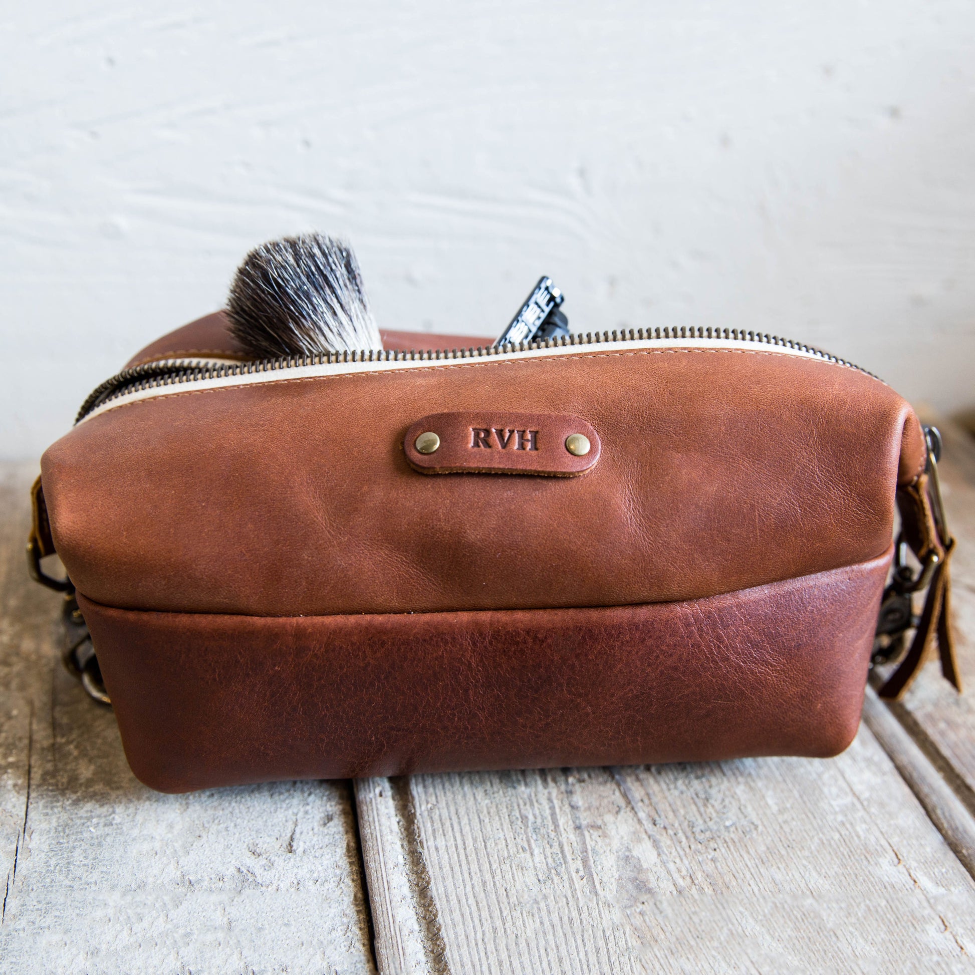 The Dopp Bag - Personalized Brown Fine Leather Shave Toiletry Bag Travel Bag With Zipper - Groomsmen Gift