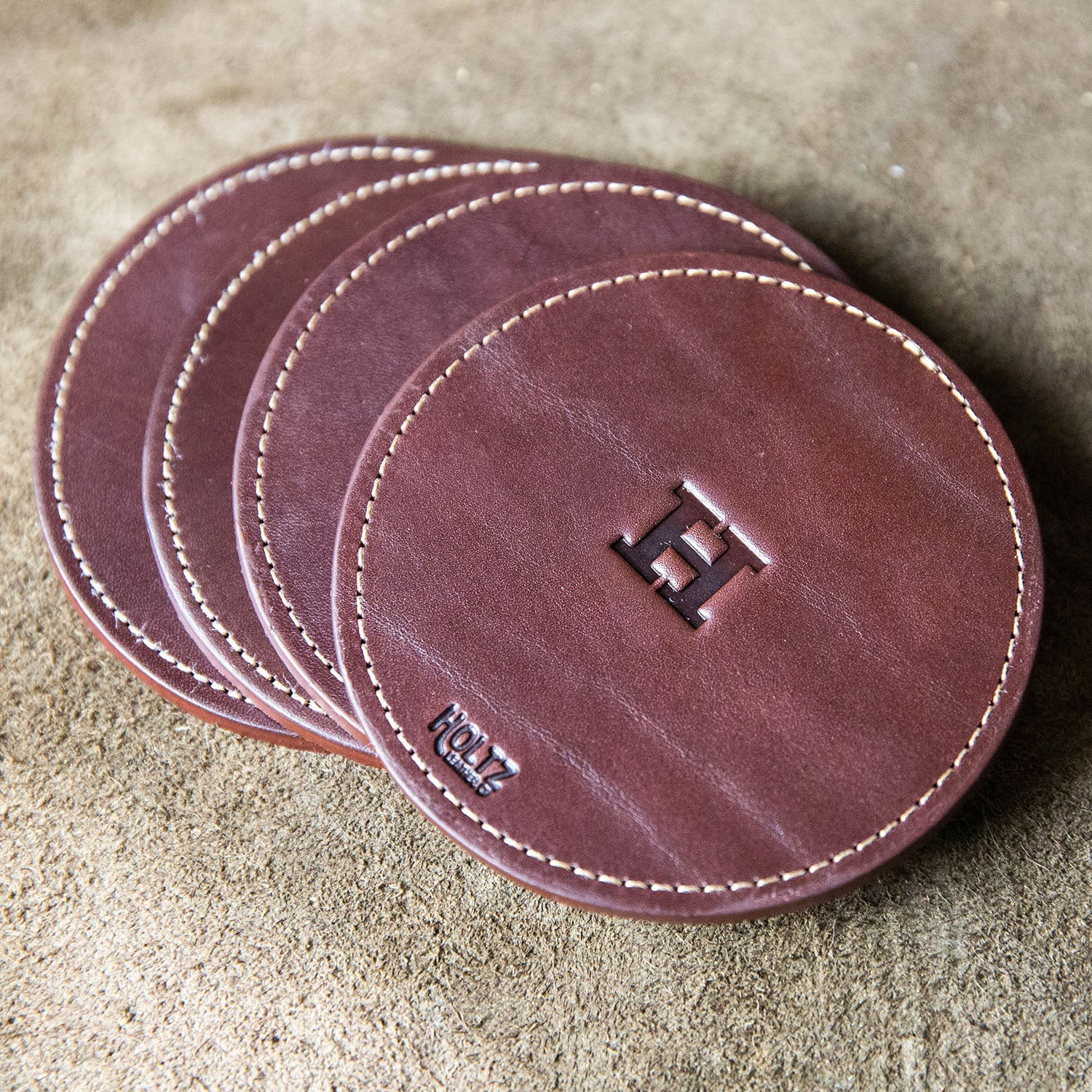 The farm house: a place where you can sit, relax, and enjoy a homey atmosphere among family and friends. This set of four Full Grain American Leather coasters, with that homey feel, are the perfect pair to your hot coffee or ice cold sweet tea. Personalize them with an initial to make them even more unique and special!