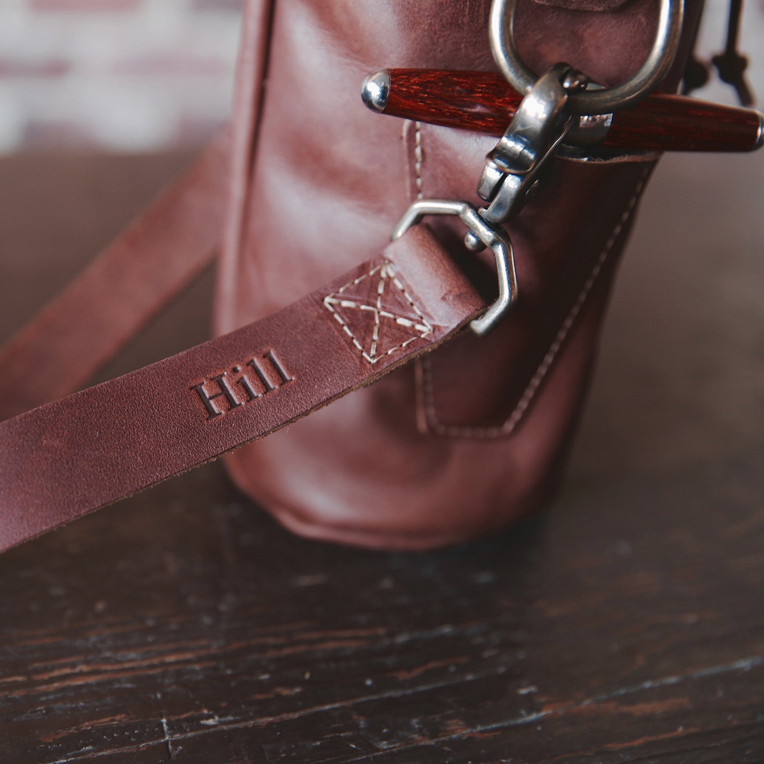 Meet the Muscadine: the perfect pair to your favorite wine. This Full Grain American Leather wine tote is sure to cause a fuss (in the best way possible) when you show up at your next gathering. The timeless design of the tote has several features that make it as functional as it is beautiful. The removable leather strap and drawstring closure make for a secure, handy carry, and the side pocket is perfect for holding a corkscrew. Add personalization to make this unique piece even more special!
