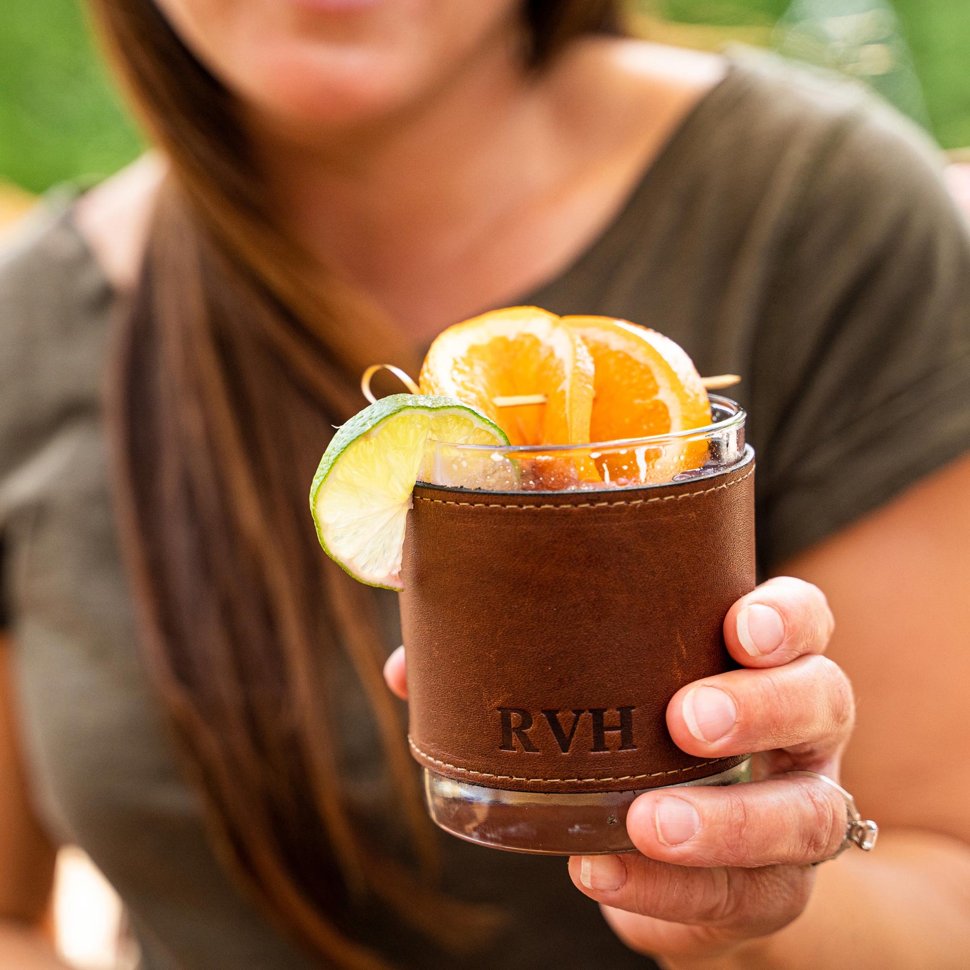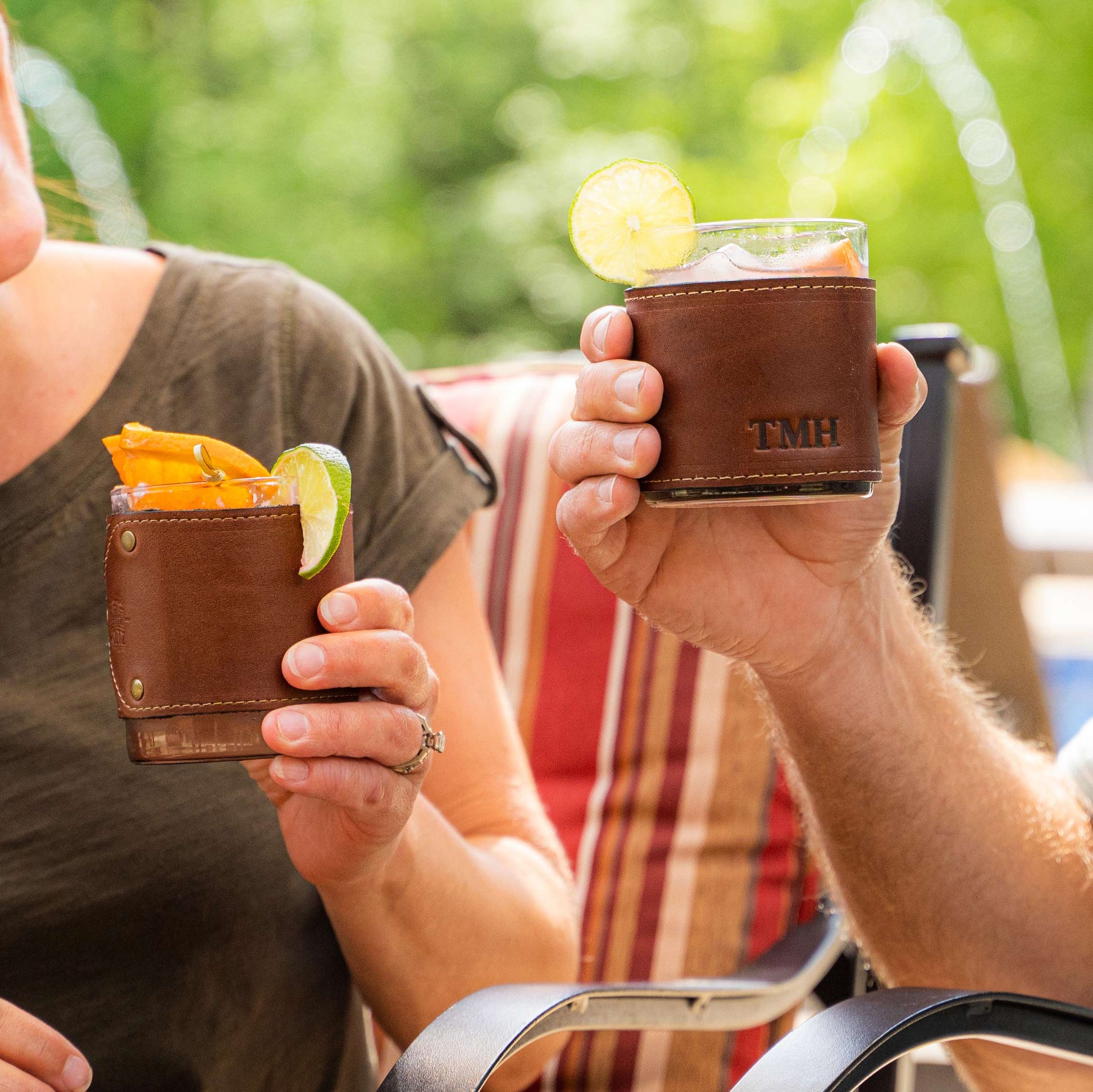 - Includes 2 10oz Glasses and 2 Leather Glass Wraps