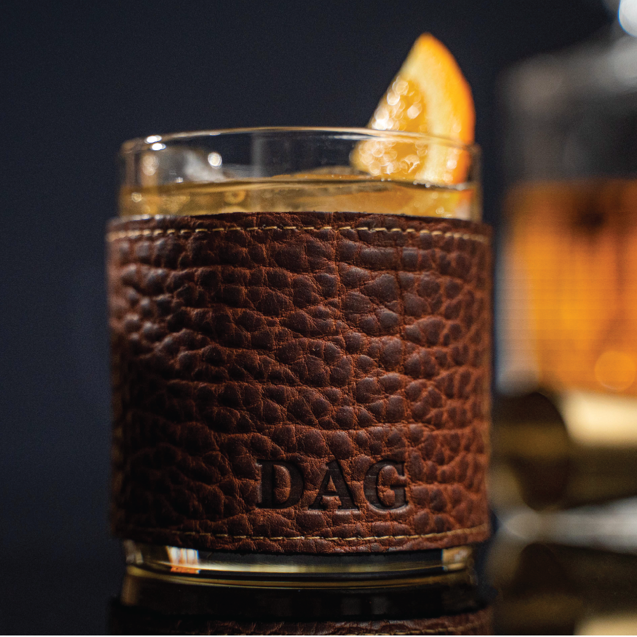 The Gentleman Rocks Glass & Sleeves ~ Shrunken Bison Leather - Set of Two Wraps & Glasses - Grooms Gift - Wedding Gift